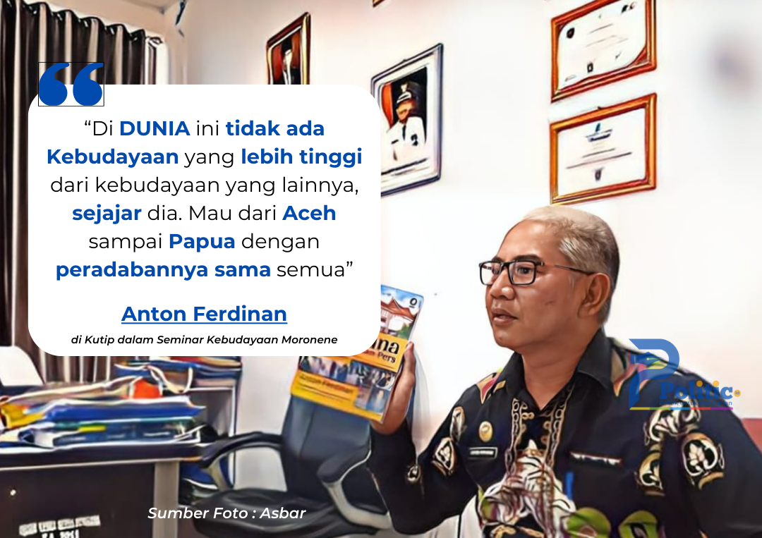 UrbanTalk.id, POLITIC.ID – Pemerhati Kebudayaan Moronene Anton Ferdinan dalam kesempatan Seminar Kebudayaan Moronene Mengajak anak muda Moronene untuk tidak boleh minder atau malu mengunakan bahasa Moronene di lingkungannya “di dunia ini tidak ada kebudayaan yang lebih tinggi dari kebudayaan yang lainnya, sejajarnya dia. Mau dari Aceh sampai Papua dengan peradabannya sama semua” (Minggu,25/8)