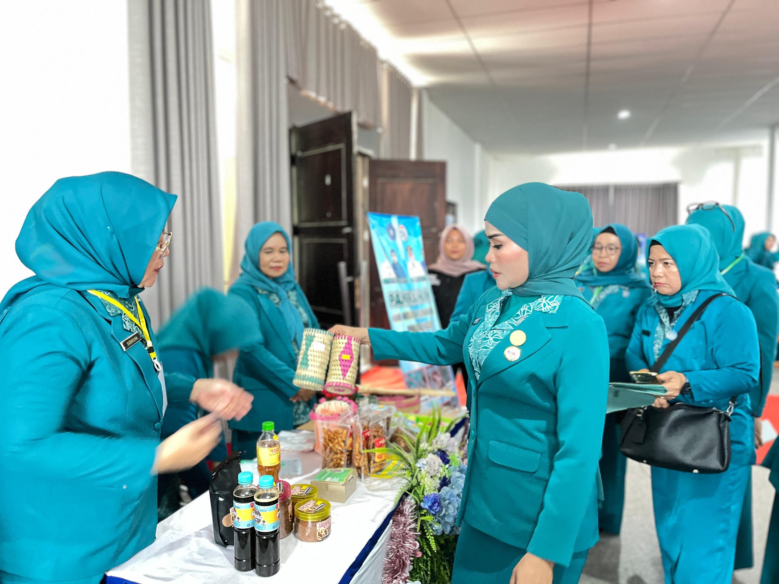 Ketua TP PKK Kabupaten Bombana, Hj. Fatmawati Kasim Marewa saat membeli salah satu produk lokal yang ikut pergelaran pameran mini produk unggulan khas Bombana. | Foto AsbarSebagai bagian dari rangkaian kegiatan, acara ini juga diramaikan dengan pameran produk unggulan lokal dari 22 kecamatan, yang menampilkan kerajinan tangan, makanan olahan, hingga produk UMKM kreatif masyarakat Bombana.